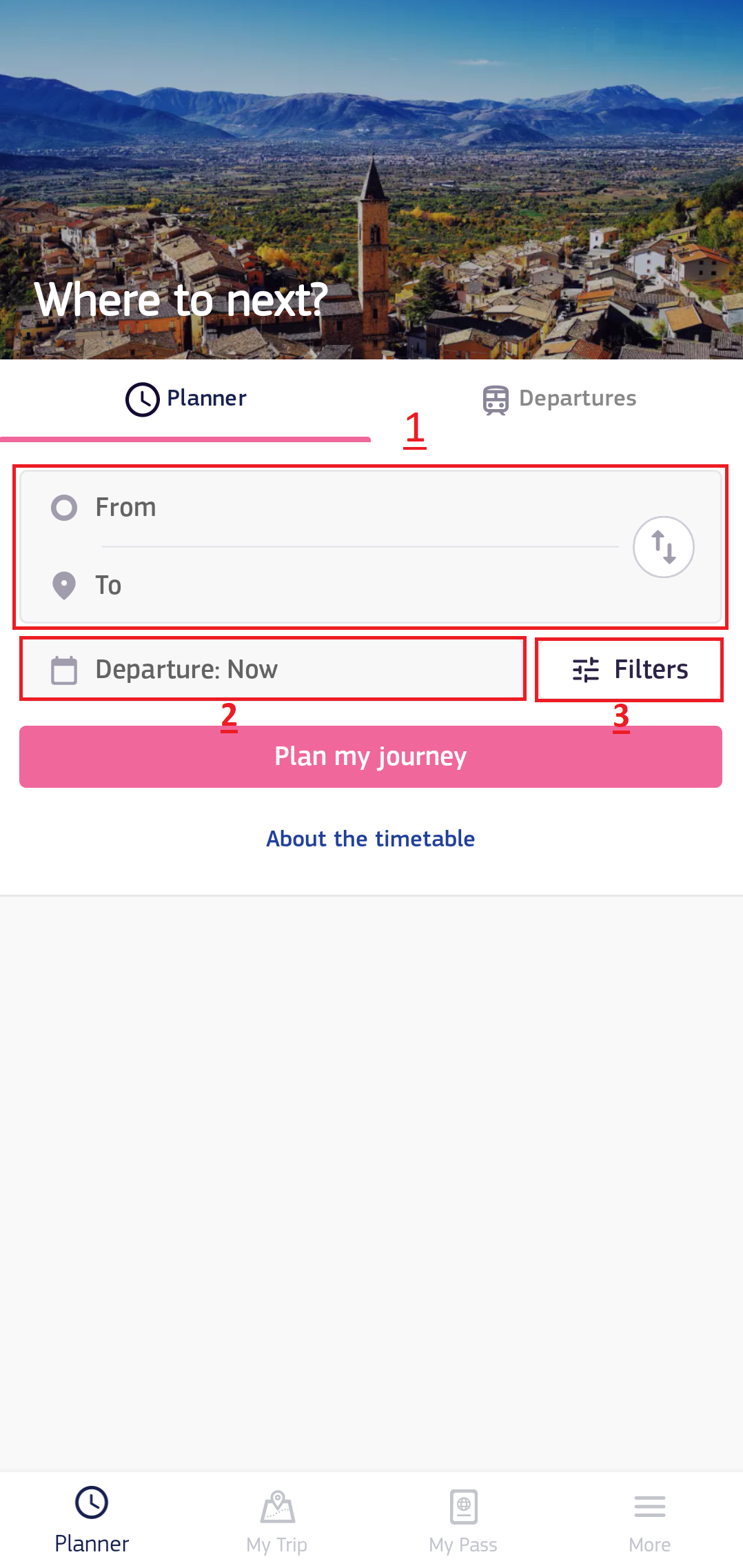 When opening the Planner, you get to see the screenshot above. In section 1 you can fill out the route you want to travel on, and in section 2 you can fill out the preferred date and time of your departure. However, don't forget to check out the ‘Filters’ button in section 3, as this includes lots of useful filters and other features to customize your journey suggestions (see below).