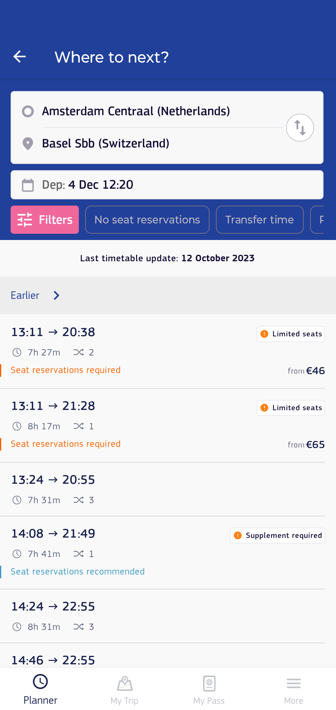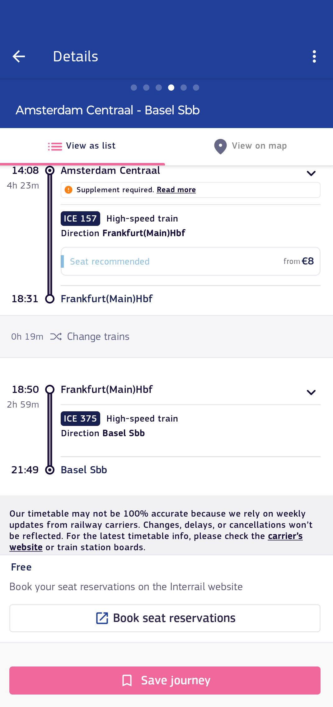 - Any special features about the route suggestion: This includes information about seat reservations (required or recommended, plus price indication), and a notice if a (part of) the itinerary falls outside of the Interrail network.