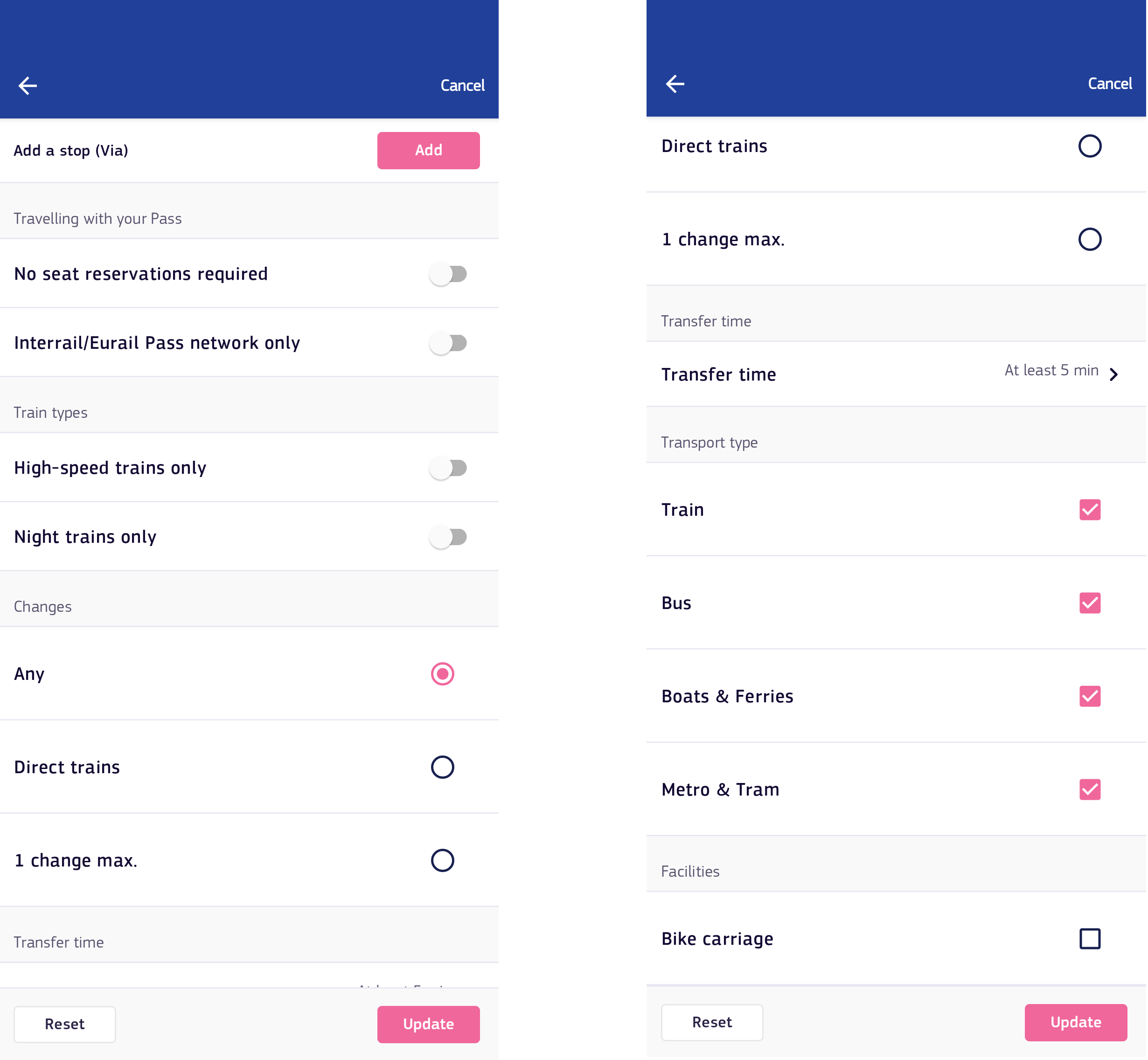 - Transfer time: Prefer a bit more time between train changes to avoid connection stress? Then apply this filter to your trip, and adjust to your liking.